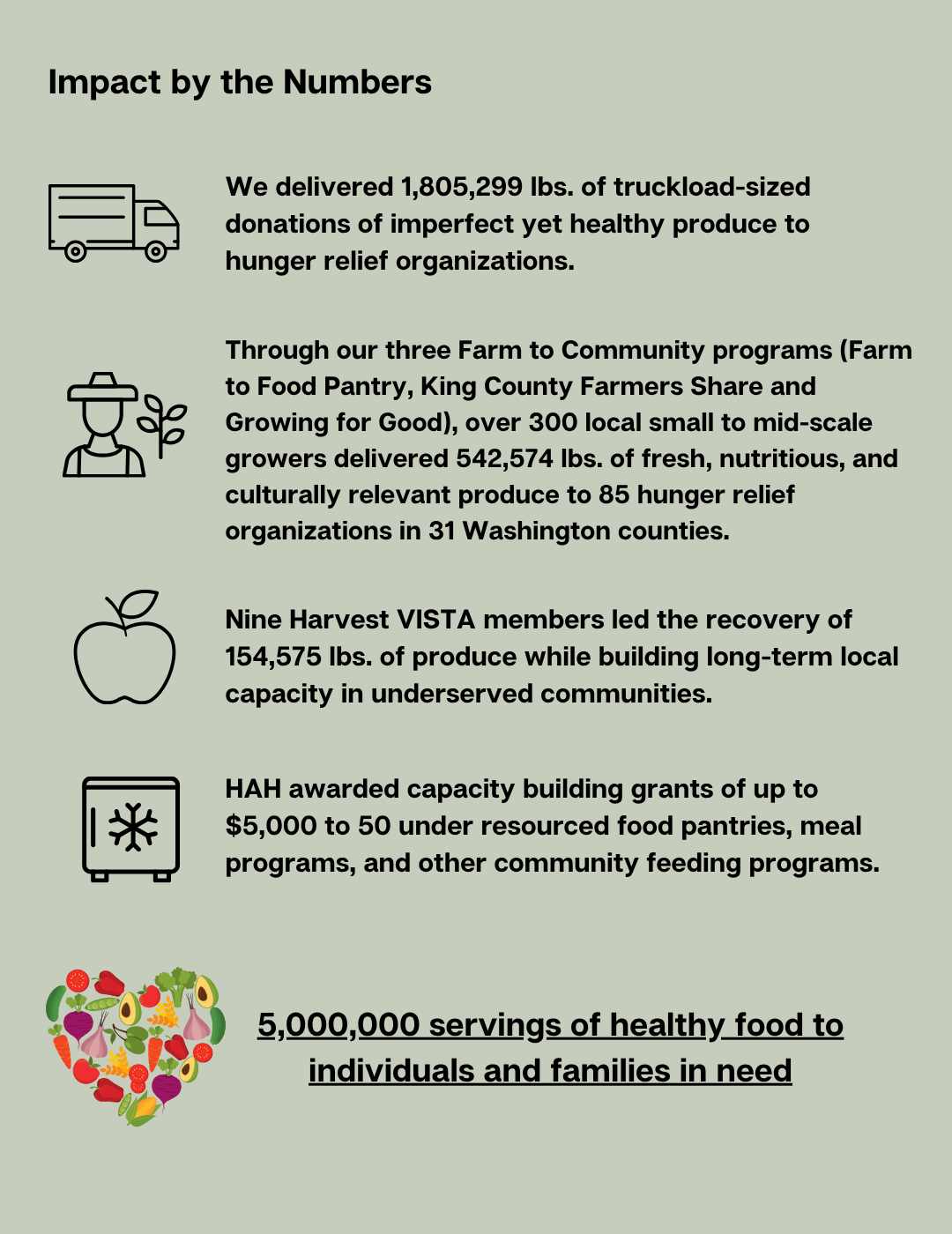 Dear Friends, In a year marked by rising food insecurity and devastating federal funding cuts experienced by many of our hunger relief partners, Harvest Against Hunger’s (HAH) commitment to increasing access to fresh healthy produce and building a more resilient and equitable food system in Washington has only grown stronger. Because of you, we connected more people in need to nutritious food and continued laying the groundwork for long-term sustainable solutions to hunger and food waste by growing a powerful movement for community-based food systems.