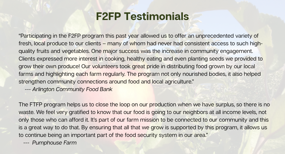 In the most recent year-end evaluation survey we conducted, hunger relief organizations scored an 8.6/10 satisfaction rating for the variety and a 9.8/10 satisfaction rating for the quality of food they received from local growers. Additionally, 77.4% of food purchased traveled less than 30 miles from the farm to the distribution site, strengthening hyper-local relationships among food producers, food distribution sites and their clients. Participating hunger relief organizations and growers agree that F2FP is more than a safety net — it’s a force for community resilience, environmental sustainability and food equity. |